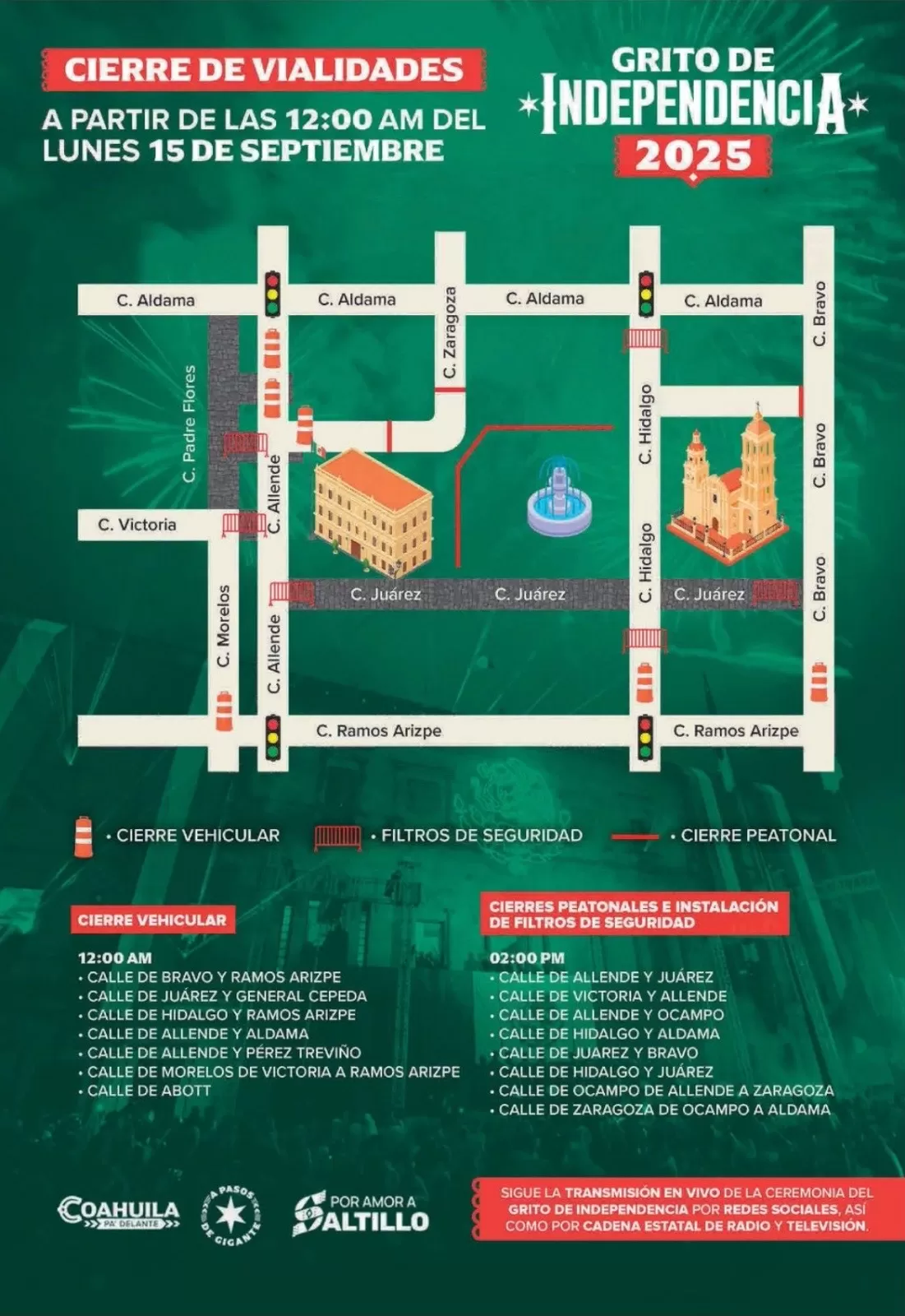 En la capital del estado, Saltillo, las celebraciones estarán a cargo de la Subdirección de Tránsito, encargada de cerrar las vialidades cercanas a la Plaza de Armas donde se llevará a cabo el emblemático Grito de la Independencia. El comisionado de Seguridad, Miguel Ángel Garza Félix, anunció que habrá un operativo de seguridad y tránsito para garantizar la tranquilidad y el buen desarrollo de las festividades.
