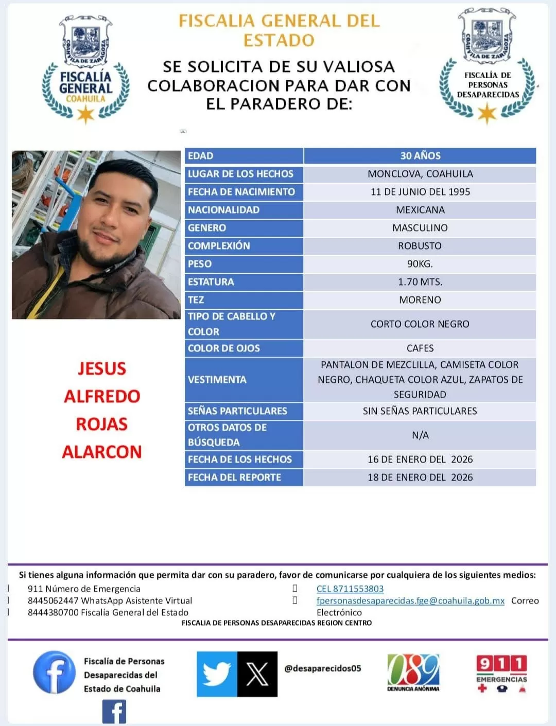 La desaparición de una persona es una situación angustiante que puede afectar a cualquier familia en cualquier momento. Lamentablemente, en la actualidad, es una realidad que se está volviendo cada vez más común en todo el mundo. En México, específicamente en el estado de Coahuila, la Fiscalía de Personas Desaparecidas ha activado una alerta urgente para localizar a Jesús Alfredo Rojas Alarcón, de 30 años, quien fue reportado como no localizado en Monclova desde el pasado 16 de enero de 2026.